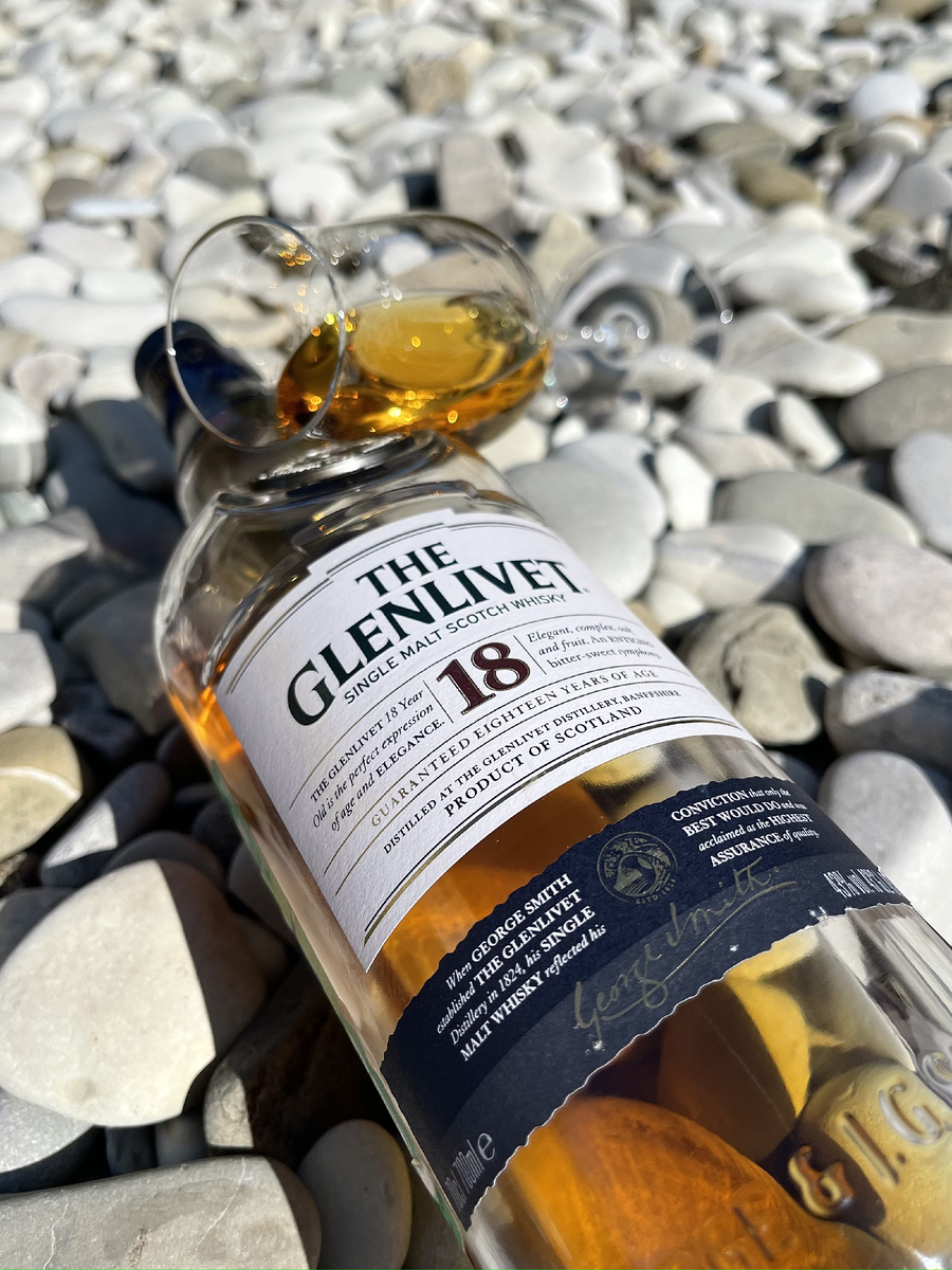 Приветствую тебя мой дорогой Читатель! Сегодня в гостях представитель Спейсайда, легкий и очень дружелюбный. Гленливет 18 лет! Glenlivet занимает почетное второе место по объему продаж в категории односолодовый виси. Данный образец был разлит в 2019 году, когда крепость его составляла 43% vol. Сейчас 3% потерялись, уступив место бесплатной водичке для редуцирования оного в 40% vol. Так что нам несказанно повезло, но если сказать честно, я пробовал и современную версию, и по памяти сильных различий не ощутил. Виски выдерживался в бочках из-под бурбона и хереса Олоросо, повторного наполнения. Итак погнали! Нос: очень приятный, деликатный аромат, ровный и округлый. При первом же вдохе ощущаются яркие, кисло-сладкие нотки ягод, смешивающиеся со свежими фруктами и абрикосовым джемом. Спустя 10 минут появилась горстка изюма, сочные персики, груша, спелый красный крыжовник и только что собранный мёд. Верхние ноты очень нежные, но если сделать продолжительный глубокий вдох, то можно ощутить бо