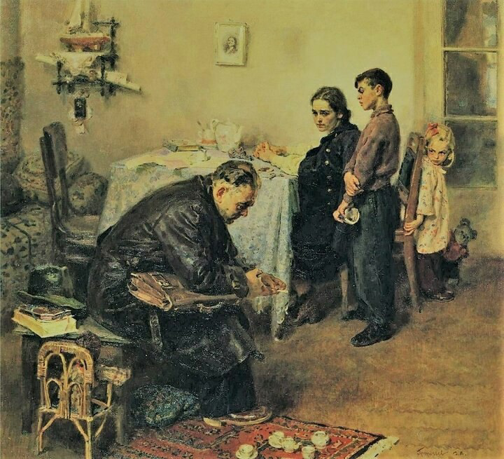 Темы любви, верности и предательства — вечные. Они находят отражение в литературе, кино и, конечно, живописи. Даже в советское время, когда цензура ограничивала творческую свободу, художники находили способы затронуть эти сложные вопросы. Неверность в их работах становилась не просто бытовой драмой, а глубокой человеческой историей, полной эмоций, конфликтов и размышлений. Давайте вместе посмотрим на четыре произведения советских художников, которые открывают перед нами драму супружеской неверности с неожиданной стороны. На этой картине изображен момент возвращения мужа, некогда бросившего свою семью. Сцена наполнена напряжением. Взгляд матери выражает смесь обиды и равнодушия: она научилась жить без него. Старший сын, вероятно, стал опорой семьи, и его закрытая поза говорит о нежелании принимать отца обратно. Единственная, кто не потерял надежду, — это маленькая дочь. Ее взгляд, полный детской веры, будто спрашивает: «Останешься ли ты теперь с нами?» Картина заставляет задуматься о по