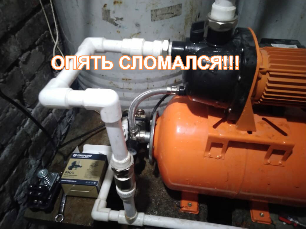 Об этой чудо-машине я писал неоднократно: постоянные поломки его меня просто бесили: заменил реле, дважды менял диффузор Вентури, несколько раз менял мембрану (это вообще нормальное явление, резиновая мембрана стареет, рвется), менял штуцер, прогнил бак гидроаккумулятора... В общем от самой насосной станции остались только двигатель, датчик давления и корпус насоса. Это и есть современное производство: никакое качество, все направлено на максимальное извлечение прибыли, а не на долговечность изделия. И вот вчера по возвращении из поездки меня встречает жена с грустным и волнующимся видом: насосная станция как-то странно работает, очень часто включается и выключается при полном отсутствии водоразбора... Открываю подполье, где у меня смонтирована система водонакопления, и вижу, что из гидроаккумулятора под большим давлением хлещет фонтаном вода. Сорвало штуцер, видимо дешевый металл прогнил. Хорошо, что со