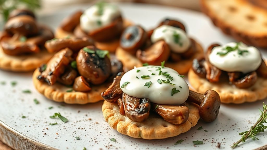 Теперь можно подумать о сервировке. Прекрасно подойдут хлебцы или крекеры, которые можно найти у местных производителей. Я всегда стараюсь выбирать те, что не содержат лишних добавок. На них выложите остывшую грибную массу и добавьте немного крема на основе сметаны с зеленью. Так вы добьётесь лёгкости и свежести в блюде.