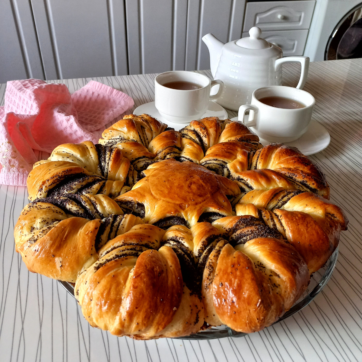 Делюсь с вами рецептом сдобного вкусного пирога с маком, который еще называют "Снежинка" или "Бабушкина салфетка". Порадуйте себя и близких домашней выпечкой! Ингредиенты: Тесто: Начинка: Также: Приготовление: Приготовим начинку. Заливаем мак кипятком. Варим, помешивая, до полного выпаривания жидкости. Добавляем сахар и перемешиваем. Приготовим тесто. Вливаем теплое молоко, добавляем 1 столовую ложку сахара, дрожжи и перемешиваем. Оставляем на 5-10 минут. Затем добавляем яйцо, еще 2 столовые ложки сахара, соль и растопленное сливочное масло. Всыпаем муку и замешиваем мягкое тесто. Оставляем в теплом месте на 1 час. Затем делим тесто на 4 части. Раскатываем первую часть и перекладываем на пергаментную бумагу. Смазываем мягким сливочным маслом. Распределяем 1/3 часть маковой начинки. Тоже самое проделываем с остальными тремя частями теста. Последний, четвертый, круг оставляем без начинки. Все слои теста разрезаем на 16 равных частей. Затем перекручиваем в противоположные стороны две