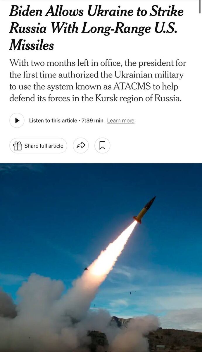 🟤Байден разрешил наносить удары ракетами ATACMS по территории РФ, сообщила New York Times; 🟤По данным NYT, ракеты ATACMS, вероятно, сначала будут использованы против российских и северокорейских войск в Курской области. 🟤По информации Reuters, Украина планирует впервые ударить ракетами ATACMS по России уже на следующей неделе. 🟤У Байдена в команде опасаются, что применение ВСУ американского дальнобойного оружия может спровоцировать ответные действия РФ против Вашингтона и его союзников. 🟤Владимир Путин еще в сентябре заявлял, что удары дальнобойным оружием по РФ будут означать участие стран НАТО в конфликте с Россией. 🟤Le Figaro сообщила, что Франция и Великобритания разрешили Украине бить вглубь России своими ракетами SCALP/Storm Shadow. 🟤Ни Белый дом, ни Пентагон не комментируют разрешение ударов дальнобойным западным оружием по РФ. 🟤Ракеты ATACMS имеют максимальную дальность 300 километров. Подписывайся на Соловьёва!
