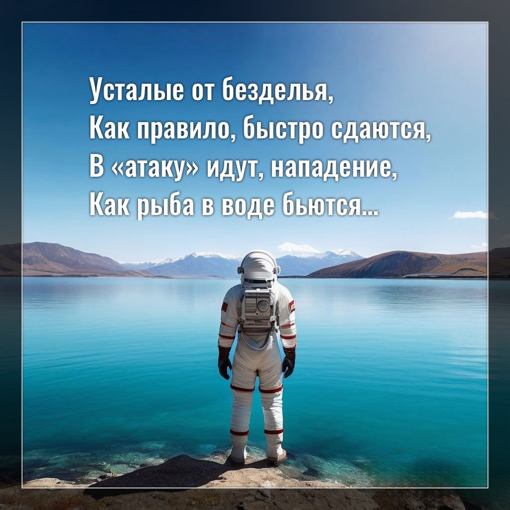 Усталые от безделья, Как правило, быстро сдаются, В «атаку» идут, нападение, Как рыба в воде бьются, Лишь бы не возвращаться Снова в то состояние, Когда нет совсем в жизни целей И жизни самой понимания. Кто был на дне, не хочет Туда опускаться в печали, Он знает, что есть всегда выход, Как бы его не ломали Обстоятельство или уроки, Он выход всегда найдёт, Потому что он верит в себя И без остановки идёт, Действует и развивается, Он знает, всему есть конец, Он верит своим Наставникам, Что присмотрит всегда ВсеОтец, Главное не лениться, Лень убивает живое, Бездействие - это чудовище, Топящее любого.