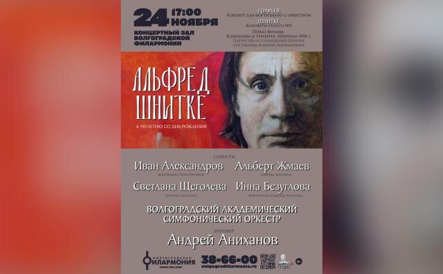Центральный концертный зал Волгограда приглашает на большой концерт к 90-летию со дня рождения выдающегося композитора Альфреда Шнитке. Волгоградский академический симфонический оркестр под управлением маэстро Андрея Аниханова в первом отделении исполнит Концерт для фортепиано с оркестром №1 учителя Альфреда Шнитке Евгения Голубева. Солист — лауреат всероссийских и международных конкурсов, пианист и композитор из Санкт-Петербурга Иван Александров. Во втором отделении прозвучат произведения самого юбиляра. В том числе — партитура, созданная Андреем Анихановым из фрагментов «Гоголь-сюиты» Шнитке и его музыки к спектаклю «Ревизская сказка». В концерте также принимают участие лауреаты всероссийских и международных конкурсов Альберт Жмаев (скрипка), Светлана Щеголева (скрипка), Инна Безуглова (фортепиано, клавесин). Концерт состоится 24 ноября, начало в 17 часов. 6+