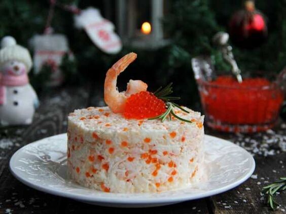 Для новогоднего угощения можно приготовить очень нежный и воздушный салатик под названием "Снежинка". Салат получается очень воздушным, нежным и вкусным. Салат готовится очень просто, подать можно в салатнике или в порционно, для этого оформить салат в кольце. Ингредиенты Яйца (нужны только белки) - 6 шт. Креветки - 500 г Рис отварной - 65 г Красная икра - 2 ч.л. + для украшения Майонез - для заправки Соль - по вкусу Рис предварительно сварить до готовности. Отделить белки от желтков. Натереть белки на мелкой терке и выложить в салатник. Перемешать все ингредиенты, добавить майонез. Верхушку салата украсила икрой и креветкой, получилось очень аппетитно и красиво. Всем советую приготовить салатик по этому рецепту, он удивит вас своим вкусом. своим вкусом.