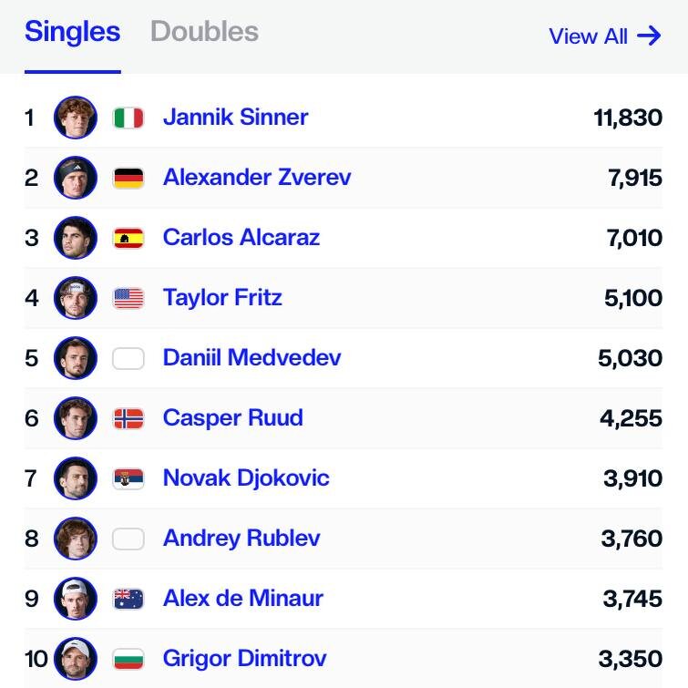 В рейтинге ATP по состоянию на 2024 год не произошло значительных изменений в позиции лидеров.