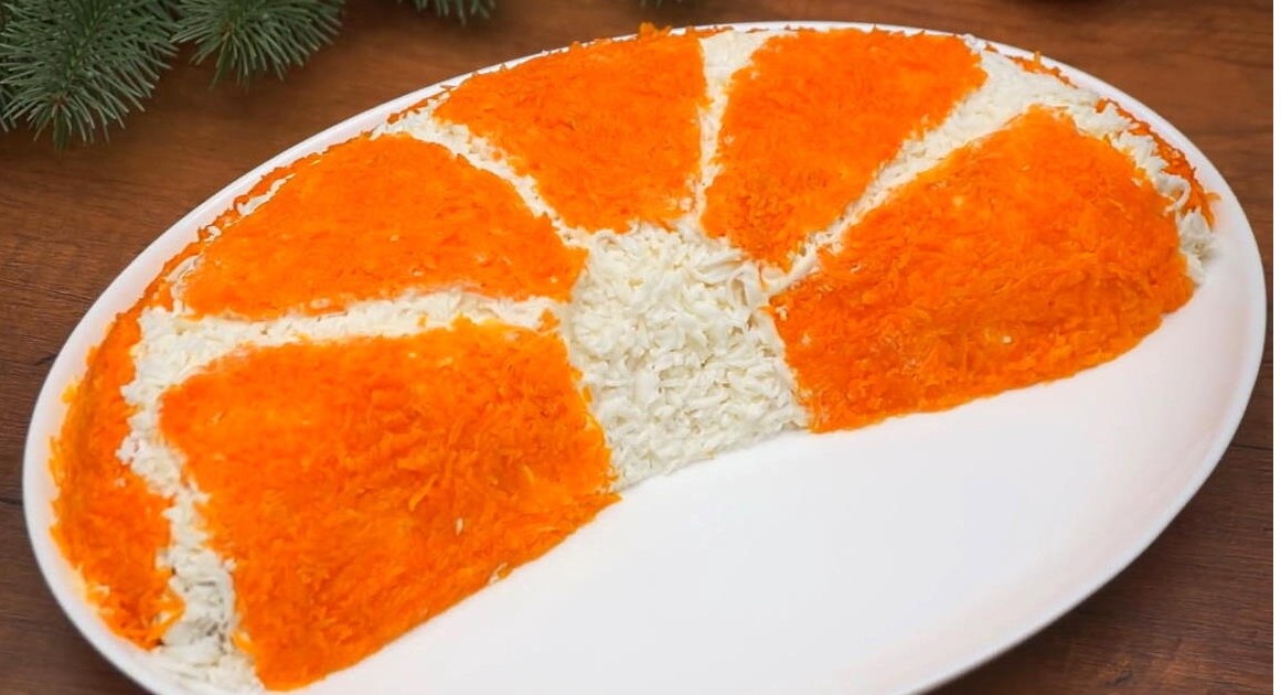 Салат «Апельсиновая долька» — это оригинальное блюдо, которое может стать украшением праздничного стола. Этот салат имеет яркий вкус и привлекательный внешний вид, напоминающий апельсиновую дольку. Ингредиенты: Приготовление: Отварите картофель, морковь, яйца и куриное филе. Натрите на крупной тёрке картофель, морковь, твёрдый сыр и яйца. Нарежьте куриное филе на мелкие кусочки. Нарежьте маринованные огурцы на мелкие кубики. Соберите салат слоями, промазывая каждый слой майонезом: