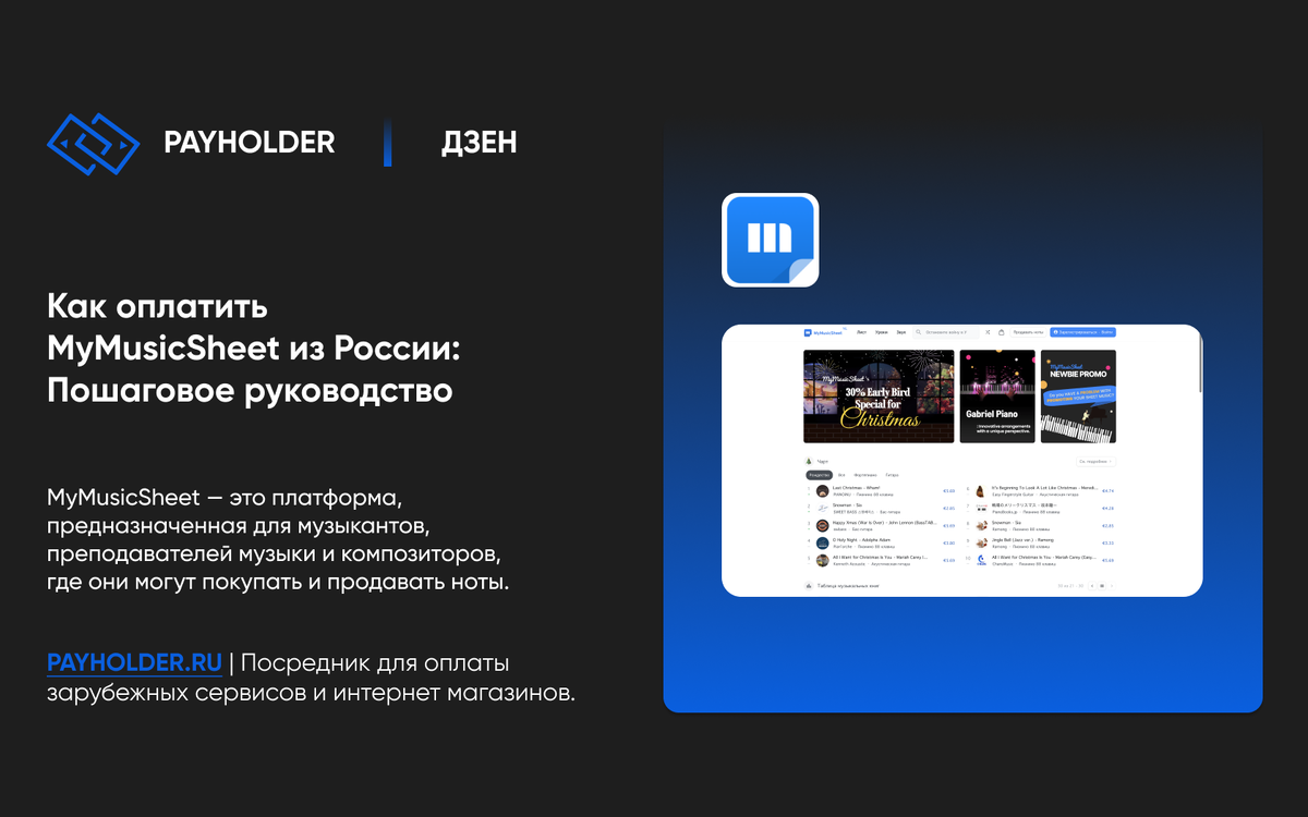 Из-за текущих международных санкций и ограничений многие российские пользователи сталкиваются с трудностями при попытке оплатить подписки или покупки на MyMusicSheet напрямую. В таких случаях на помощь приходит платформа PayHolder.
