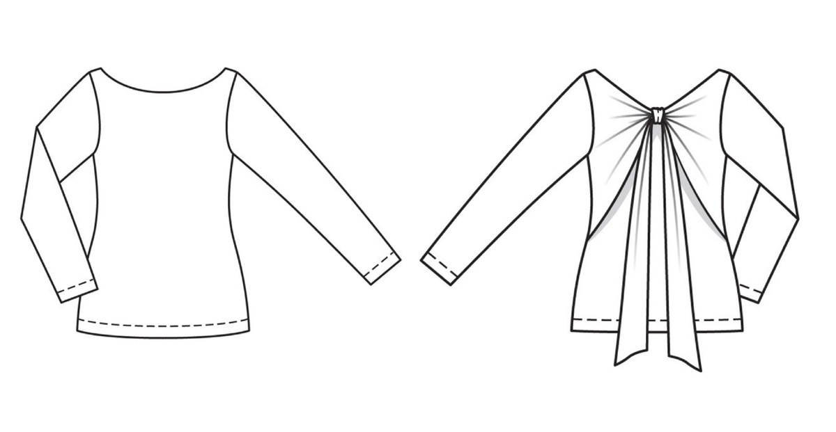 Будем разбираться. Для пошива пуловера подойдут эластичные трикотажные полотна, обеспечивающие комфорт и свободу движений. Важно выбирать ткани с подходящим составом, например, с хлопком, лайкрой или полиэстером, чтобы они были приятными на ощупь и не теряли форму после стирки.Обратить внимание на плотность трикотажа, чтобы избежать прозрачности и при этом обеспечить свободу движений. Снятие мерок — следующий важный шаг. Необходимо измерить объем груди, талии, бедер, длину рукава и обхват плеча. Трикотаж допускает небольшие отклонения от размеров благодаря своей эластичности. Перед пошивом обязательно декатируем отрез полотна. Не забывайте, что припуски в выкройку НЕ ВКЛЮЧЕНЫ. После раскроя дублируем согласно схеме. Верхнюю деталь спинки со сгибом (23), дублируем только одну деталь. Вторую дублировать не нужно. Верхние детали спинки складываем лицевыми сторонами внутрь и прокладываем строчку по нижнему и верхнему срезу. У верхних срезов строчку закончить у контрольной метки 1, плеч