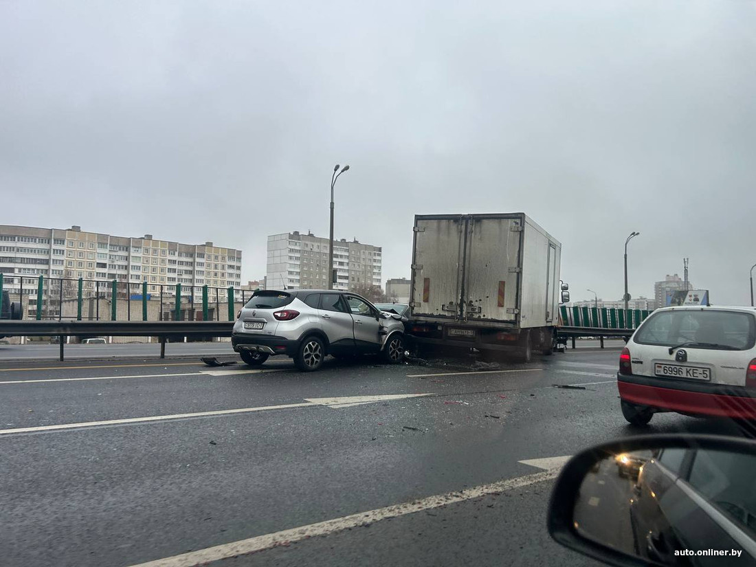 В субботу, 16 ноября, ГАИ Минска сообщила о массовой аварии на МКАД. Днем там столкнулись шесть автомобилей. Двоих пострадавших увезла скорая. «Это будет надолго, их разбросало по полосам» — Проезд заблокирован, все ряды, — сообщали водители, проезжавшие место происшествия. — Все объезжают через парковку торгового центра либо по улице Слободской. Семь машин — это будет надолго, их разбросало по полосам. Очень быстро и обходной путь через парковку торгового центра оказался отрезан — затор. На МКАД же освободили для движения правый ряд, но быстро ситуацию это не улучшило. Момент ДТП. Видео Сегодня наш читатель предоставил корреспонденту Onlíner видео с регистратора, установленного в одном из автомобилей, участвовавших в ДТП. Как стало известно корреспонденту Onlíner, по предварительной версии, водитель грузовика врезался в автомобиль, который стоял в крайней правой полосе со включенной аварийной сигнализацией. От удара грузовик выехал в средний ряд, столкнулся там еще с одной машиной