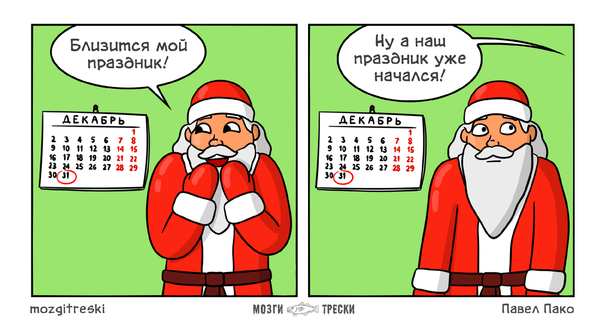 Новый год уже совсем скоро и наверняка многие из вас уже закупились подарками, а кто-то, возможно, даже успел их получить. И сегодняшнюю праздничную подборку комиксов я как раз решил посвятить теме подарков, так что на этот раз вас ждут забавные комиксы про Дедов Морозов, продавцов, упаковку, вязанные свитера и неожиданные сюрпризы. Надеюсь, что вам понравится! Первый комикс в этой подборке нарисовал я лично - это один из выпусков моей серии Мозги трески. Выходила эта зарисовка совсем недавно и была вдохновлена личным опытом: закупаясь подарками для близких на очередной распродаже, я подумал, что будет забавно нарисовать такой сюжет. И еще один комикс от меня - на этот раз из серии Почти 100 привидений, которая выходит вот уже пару лет (кстати, первый печатный сборник все еще можно найти в магазинах). В одном из выпусков данного проекта встретились два известных персонажа - Санта-Клаус и Смерть. О чем же они могли поболтать? Давайте посмотрим. У новосибирского художника и стендап-комик