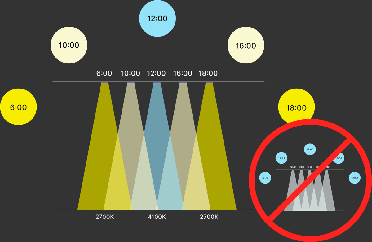 Исследования последних лет подтверждают важность биодинамического освещения, учитывающего циркадные ритмы человека. С утра – свет более теплый, постепенно меняющийся на естественный белый (4100К) или холодный (5000-6500К). Пик изменений – обеденное время, после чего к вечеру цветовая температура вновь плавно «опускается» до 2700К. В обычных условиях достичь такого результата (с учетом баланса между естественным и искусственным освещением) практически невозможно.