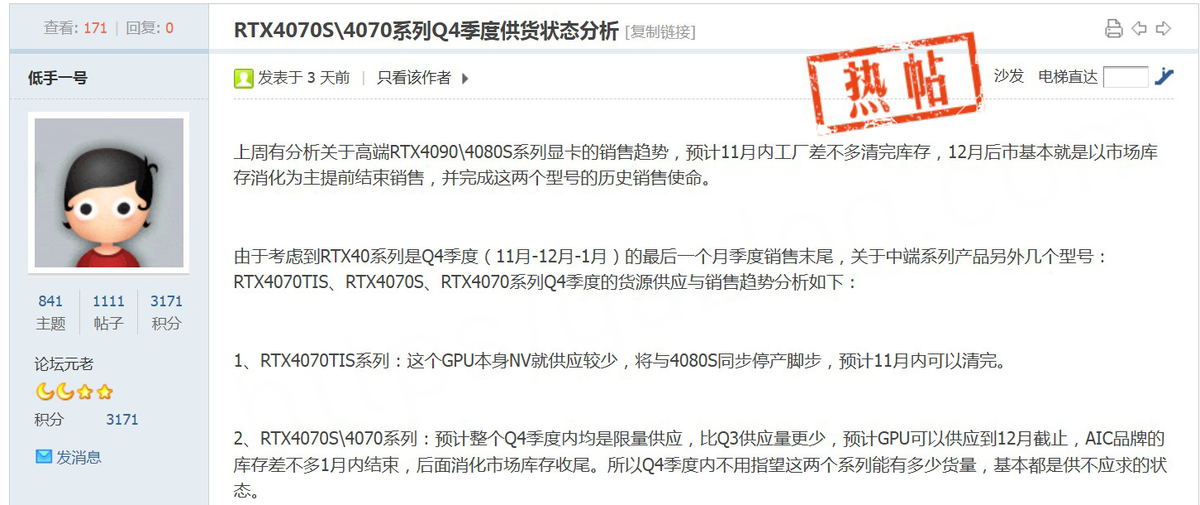 Упоминается, что у NVIDIA сейчас мало запасов GeForce RTX 4070 Ti SUPER, и они будут легко распроданы к концу текущего месяца. Производство RTX 4070 SUPER и RTX 4070 прекратится к концу ноября или началу декабря, и заявлено, что поставки чипов будут осуществляться до декабря, а последние запасы партнерами будут распроданы к январю, что как раз совпадает с запуском серии RTX 50.
