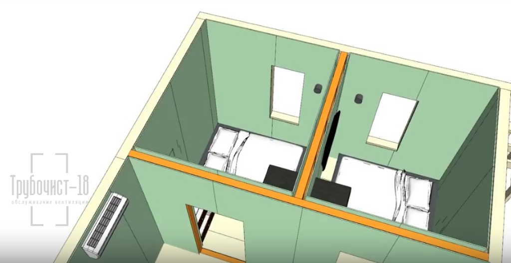 На примере нашей планировки видим два приточных клапана в спальнях.