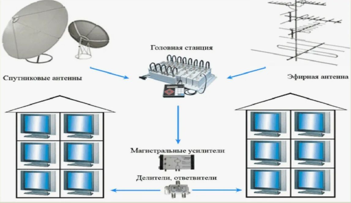 Система коллективного приема телевидения (СКПТ) — это система, обеспечивающая прием и ретрансляцию пакета эфирных телевизионных каналов, программ радиовещания в УКВ диапазоне, а также спутниковых программ. Основная цель СКПТ — предоставить качественный сигнал телевизионных и радиоканалов в многоквартирных домах, офисных зданиях или других объектах с большим количеством пользователей. Проектирование СКПТ позволяет создать эффективное и современное решение для стабильного приема эфирных и спутниковых сигналов. Это особенно важно в условиях плотной городской застройки, где часто возникают проблемы с качеством сигнала из-за интерференции прямых и отраженных волн или зон радиотени, которые возникают за высокими зданиями. В состав Системы коллективного приема телевидения входят следующие элементы: Для создания проекта СКПТ необходимо предоставить следующие исходные данные: Проектирование и установка СКПТ осуществляется в соответствии с рядом нормативных документов: Чтобы узнать точную стоим