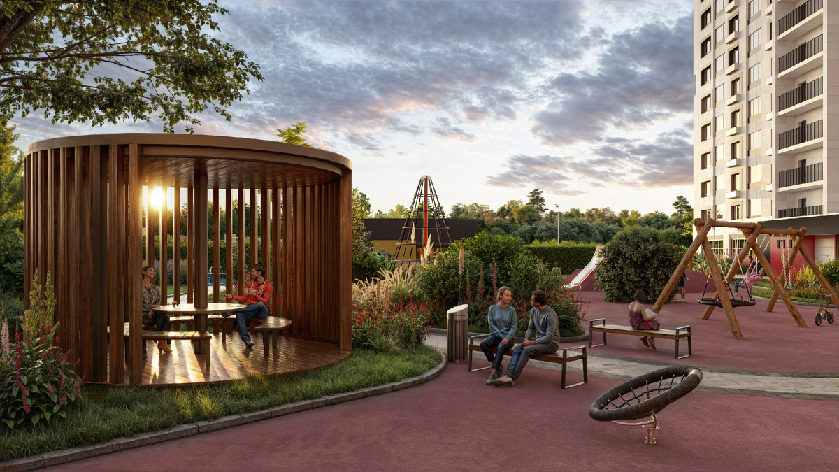 Особенностью станет благоустройство придомовой территории, в концепцию которого заложена идея «леса во дворе» с обилием зеленых насаждений и природных элементов. А собственный сад с цветниками и тропами для прогулок дополнит «лес» и украсит территорию жилого комплекса. Во дворах семейного квартала можно знакомить и поддерживать интерес детей к флоре, играть, заниматься спортом на открытом воздухе. Каждый житель квартала сможет найти для себя занятие по душе.