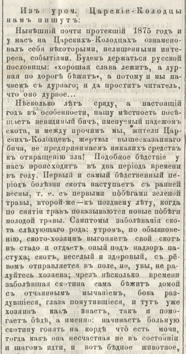 Из уроч. Царские Колодцы нам пишут: «Нынешний почти протекший 1875 год и у нас на Царских Колодцах ознаменовал себя некоторыми, не лишенными интереса событиями. Будем держаться русской пословицы: «хорошая слава лежит, а дурная по дороге бежит», а потому и мы начнем с дурного; и да простит читатель, что оно дурное... Несколько лет сряду, а настоящий год в особенности, нашу местность посещает невидимый бич, именуемый падежом скота, и, между прочим, мы, жители Царских Колодцев, жертвы вышесказанного бича, не предпринимаем никаких средств к отвращению зла! Подобное бедствие у нас происходит в два периода времени в году. Первый и самый бедственный период болезни скота наступает с ранней весны, т. е. с первыми побегами зеленой травы, второй же — к позднему лету, когда по снятии трав показываются новые побеги молодой травы. Симптомы заболевания скота следующего рода: утром, по обыкновению, скотохозяин выгоняет свой скот в стадо и отдает оный под надзор пастуха; скот, веселый и здоровы