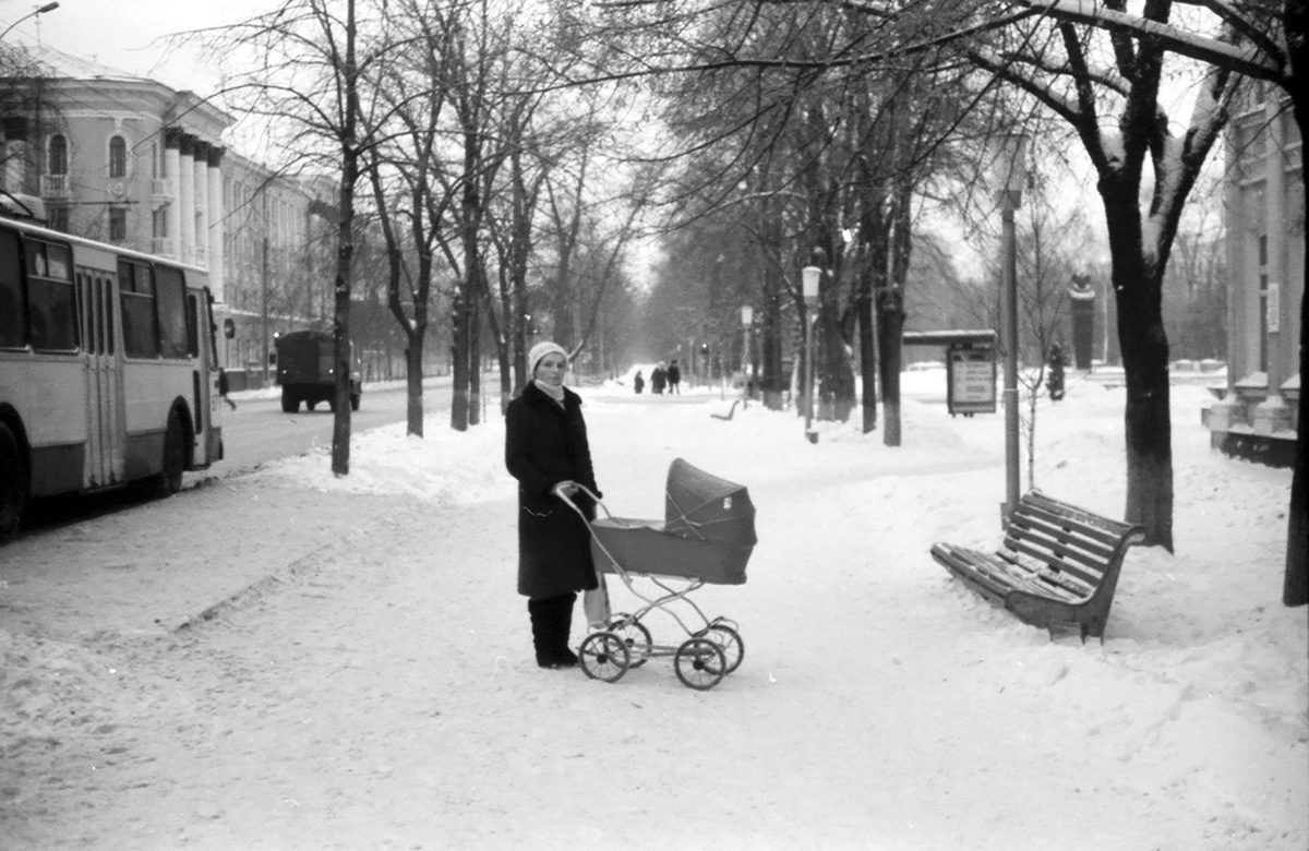 Улица Октябрьская, 1986 год. Из важных изменений с тех пор - вместо скамейки поставили "умную" остановку.
