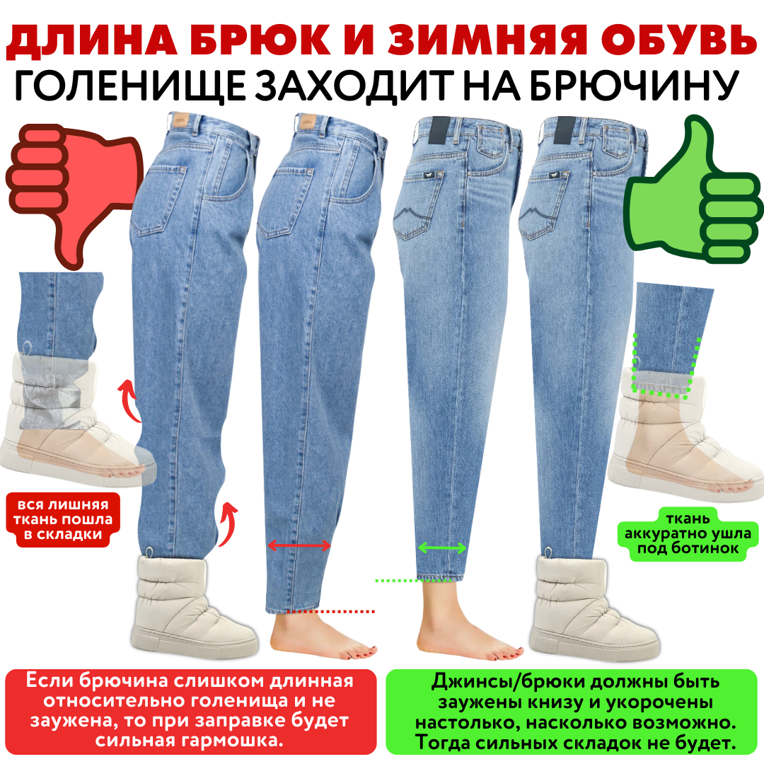 ✅ Во-вторых, для таких целей ❗️нужно❗️сразу брать максимально укороченную модель. Более того, на зимний сезон хорошо иметь набор брюк и джинсов такого кроя, которые вы еще чуть укоротили сверх той длины, что была.