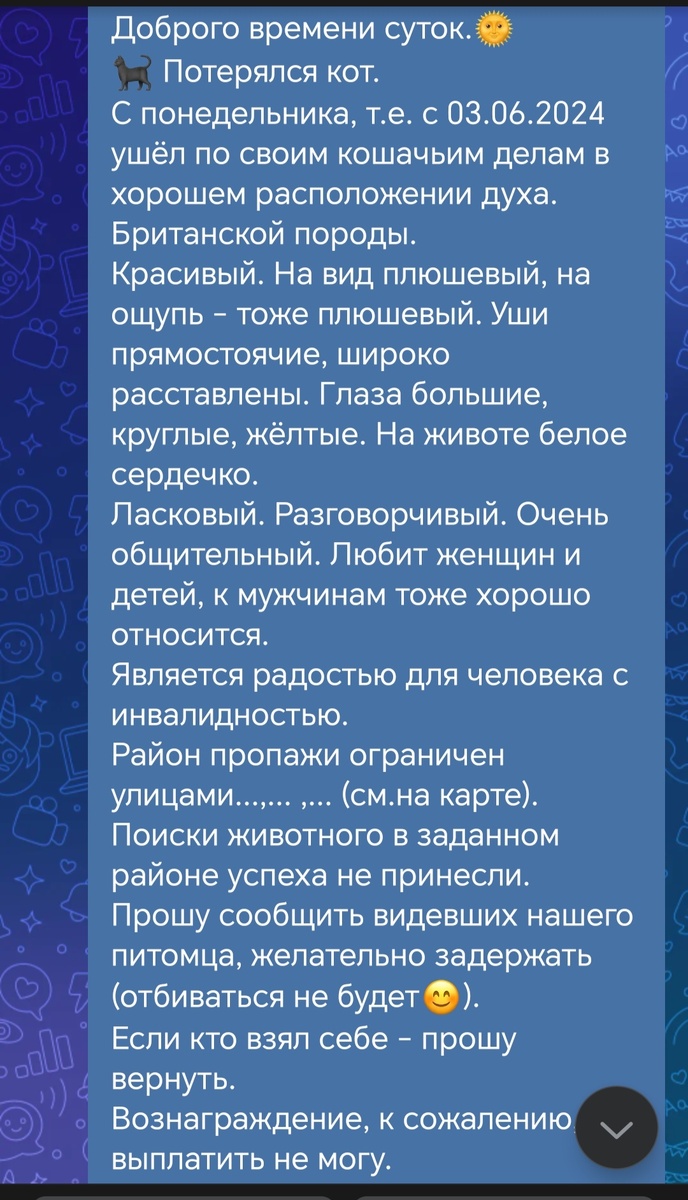 Даже из района звонок был, несмотря на расстояние в 20 км от города. Кот, обнаруженный в сельской местности, был взвешен временной хозяйкой и фото показаний весов было мне отправлено в ВК. Несмотря на мои заверения, что наш изящный Бусик не может весить 6 кг 438 г, я была вынуждена установить видеосвязь с этими милыми людьми. Только тогда они поверили, что это не наш кот.
