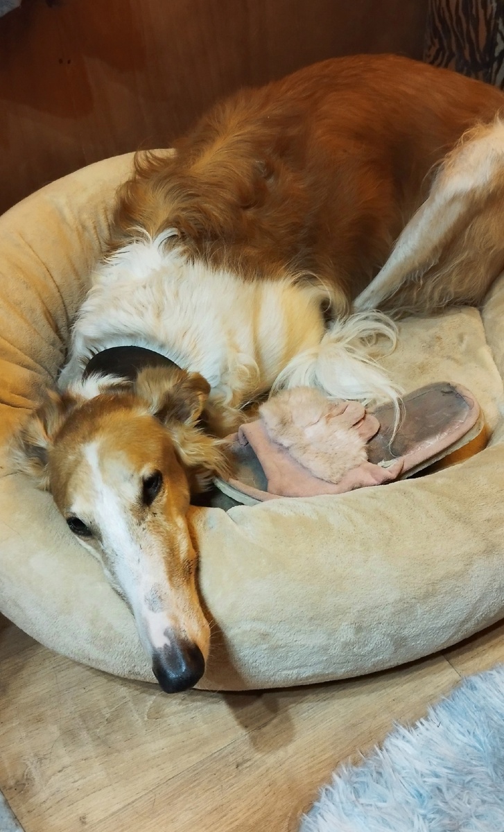 Я украл у мамы тапок, принёс в лежанку и замечательно с ним сплю😁 Моим собакам наверное повезло, у них куча игрушек, в прямом смысле несколько ящиков.От маленьких пищащих мячиков (которые я к слову терпеть не могу), до больших пуллеров и летающих тарелок. Каждому по способностям как говорится. Замечено, что овчарки, стафорды, ризены и кане корсо сходят с ума от пуллеров и мячиков, но не против и за палочкой побегать. А вот у борзых совсем другие предпочтения. Например у моего Барона есть любимая белка с пушистым хвостом, это такое сшитое из двух крепких мячиков тельце и к ней пришит мягкий пушистый искусственный хвост. Но самая значимая и дорогая это "добытая" игрушка и не важно какая она, может тапок, может полотенце, может ещё что-то. Пикси сходит с ума от своей жёлтой курицы, вы могли неоднократно наблюдать её фото и видео с этой курицей в зубах. На самом деле курицы три штуки-одинаковые, одна для дома, вторая для улицы, а третья для прогулок в парке или в лесу. Подро