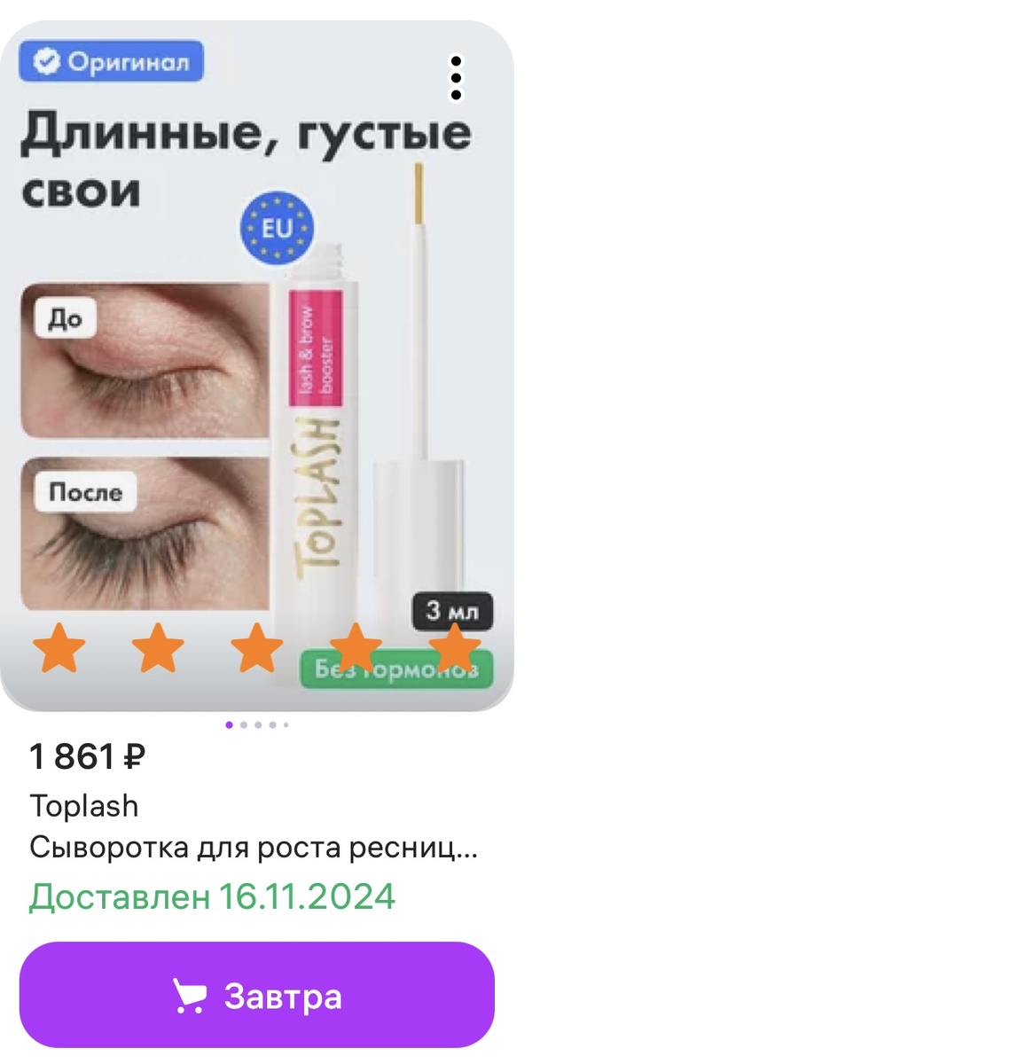 Привет! Ох уж эти блоггеры😂 Нет-нет, да подкинут разные идеи. И, хоть я не особо падкая на чужие покупки, отзывы и всё прочее, этот продукт покоя мне не давал уже год-другой. Итак, время пришло. Я наращивала ресницы в течение ровно года, сейчас сняла все остатки и планирую в очередной раз слезть с этой иглы апгрейда и начать нормально воспринимать своё лицо, без ощущения «крот», «мышь», «моль» и тому подобное. Я ждала чёрной пятницы 11.11, в надежде, что многие товары можно будет купить выгоднее, но мой план с треском провалился, что меня не особо-то и расстроило. Периодически сравнивала цены на Toplash в разных магазинах, и по итогу заказала на Wildberries, за 1861₽, и 200₽ мне вернул продавец за отзыв. Получилось 1661₽ за 3 мл. - вполне себе приятная цена. Упаковано всё очень красиво, стильно, мило. Коробка опечатана пломбой, можно быть уверенной, что никто не вскрывал. Содержимое: сама сыворотка в коробочке, флакон запаян в слюду, всё идеально; инструкция, линейка-измеритель ресни
