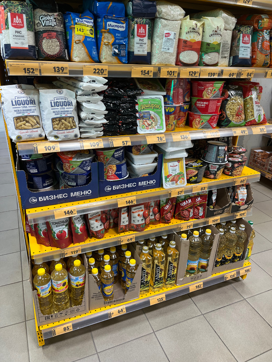 Всем привет дорогие читатели! Как человек, который регулярно посещает различные магазины, сегодня я подготовила для Вас продуктовый обзор из магазина «Пятёрочка». В этом обзоре, в формате фото шоппинг покажу некоторый ассортимент товаров по скидкам и акционные предложения на этой неделе. Изображения на канале не являются рекламой, а лишь информирует аудиторию об акциях, скидках и ценах в магазинах. Все, что я пишу и говорю в социальных сетях, это мое оценочное суждение. Как всегда пишу на бегу, в другой магазин, чтобы скорей поделиться с Вами свежими обзорами, могут быть ошибки в статье, так, что ценители русского языка не судите строго 😉 Когда входишь в магазин, то сразу бросается в глаза широкий выбор продуктов и стойки с товарами по акции. Хотя если честно, то я обратила внимание, что в магазине около 80 % товара, а может и то больше, все по желткам ценникам, либо скидкам. На этой стойке предлагают бакалею по акции. Одной из главных причин, почему я часто захожу в «Пятерочку