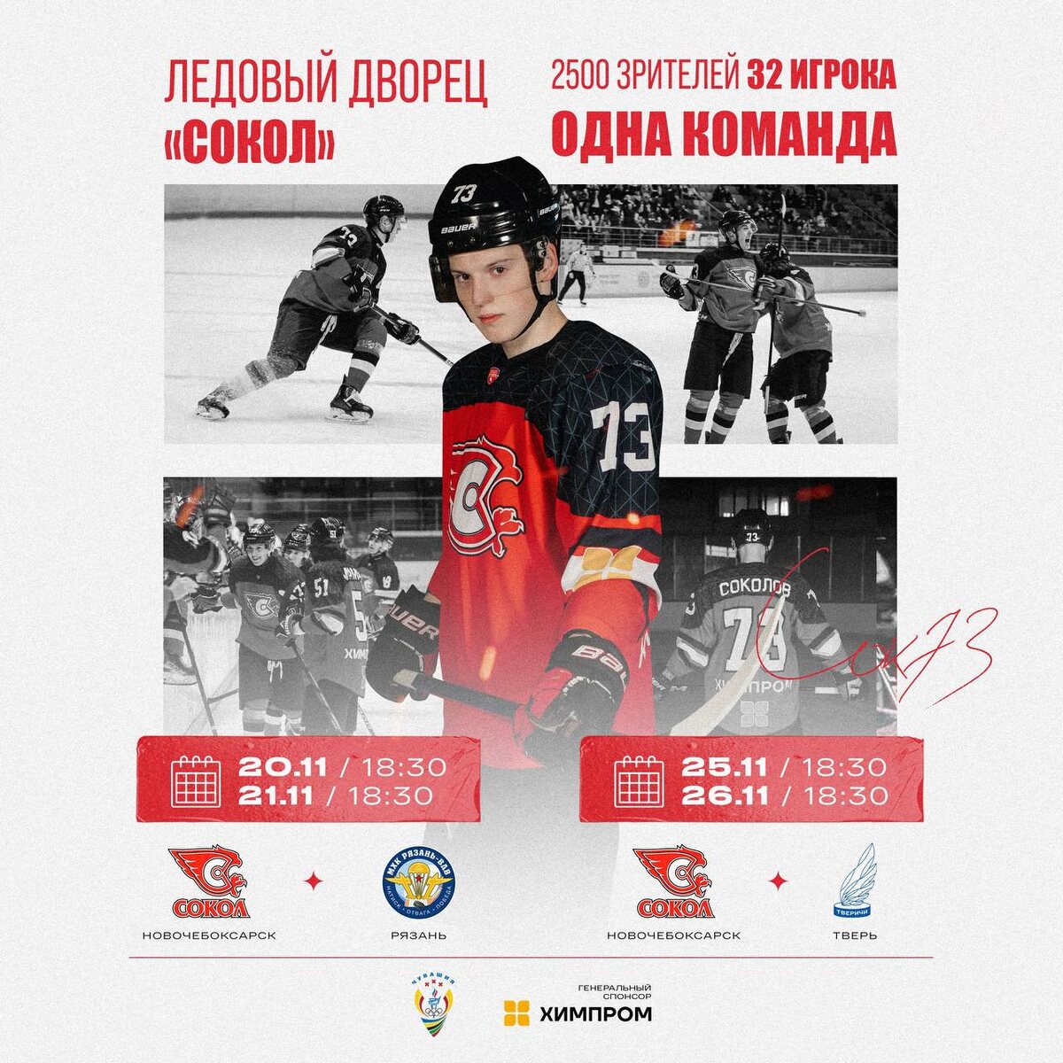 Хоккейный клуб «Сокол» приглашает всех поклонников хоккея на две пары захватывающих матчей, которые пройдут в Ледовом дворце «Сокол» в Новочебоксарске. 20 и 21 ноября команда встретится с «Рязань-ВДВ», которая занимает высокие позиции в турнире и показывает отличные результаты в текущем сезоне НМХЛ. Затем, 25 и 26 ноября, «Сокол» сыграет с командой «Тверичи-СШОР», серьезно улучшившей свои показатели по сравнению с прошлым годом и уверенно противостоящей сильнейшим клубам лиги. Вход на матчи свободный, игры начнутся в 18:30. Ледовый дворец расположен по адресу: Новочебоксарск, ул. Жени Крутовой, д. 1А. Доступен междугородный транспорт из Чебоксар, а возле дворца есть парковка. В фойе гостей ждут интерактивные игры и новые коллекции официальной атрибутики клуба. Приглашаем болельщиков приходить с друзьями и родными на зрелищные хоккейные баталии!