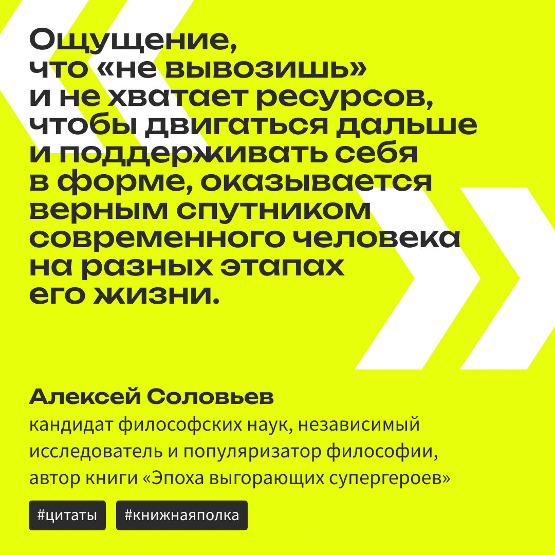 «Я не вывожу» «Что за хрень происходит?» Как часто вам в голову приходят такие мысли? Можете ли вы, когда энергии хватает только на работу в режиме автопилота, добавить в свою жизнь «до кучи» еще и, к примеру, дополнительное обучение? Много ли вы прокрастинируете, залипая в социальных сетях? Жалуетесь ли друзьям, знакомым и коллегам, что не можете взбодриться, чтобы не только активнее работать, но и заниматься чем-то приятным? «Для множества людей из разных слоев общества по всему миру подобное состояние не является исключением, чем-то экстраординарным», — пишет в своей книге «Эпоха выгорающих супергероев. Как саморазвитие превратилось в культ, а погоня за счастьем завела нас в тупик» независимый исследователь и популяризатор философии Алексей Соловьев. Он поясняет, что «в этом ощущении экзистенциальной дезориентации возникает чувство потерянности и целый спектр других сложных эмоциональных состояний, в которых нет ясного понимания, как из них выбраться и действительно жить своей