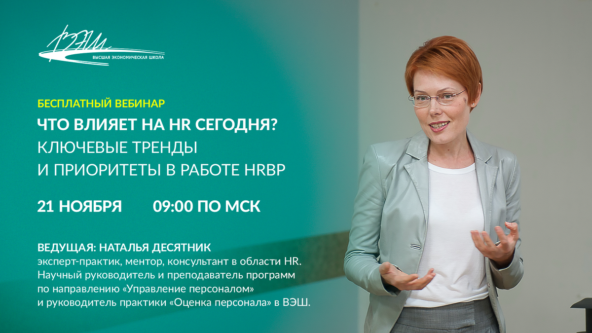21 ноября в 09:00 (Мск) Наталья проведет бесплатный вебинар «Что влияет на HR сегодня? Ключевые тренды и приоритеты в работе HR BP». Присоединяйтесь!