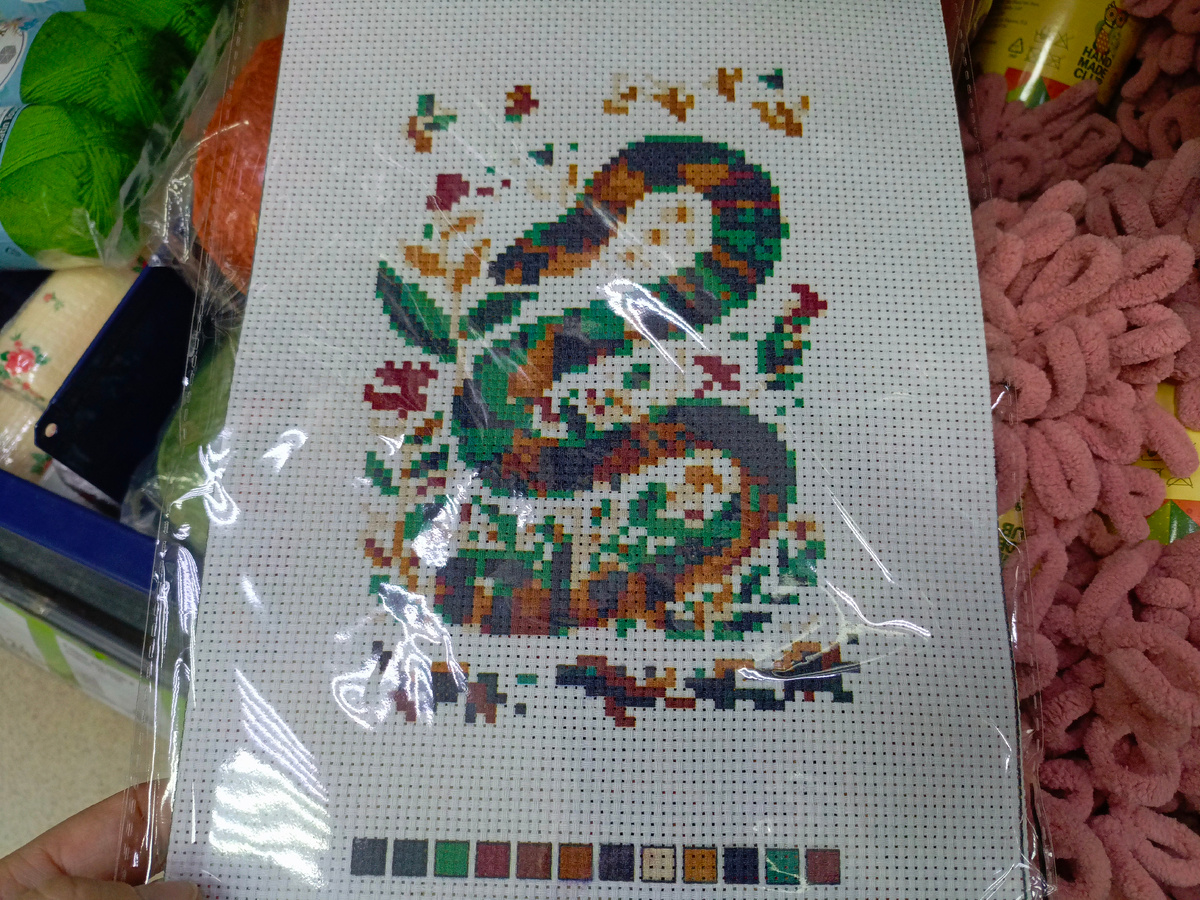 Всем привет. Мы сегодня зашли в магазин Фикс прайса за пластилином и кинетическим песком для сына и за одно прогуляться посмотреть на новогодние игрушки, канцтовары и другие товары. В отделе рукоделия появились наборчики для вышивки крестиком. Наборчик "Змейка" символ 2025 года. Вот такая собачка на зимней прогулке. Девочка украшает елочку звездой. Зимний пейзаж. И вот такой старичок санта-клаус. Размер вышивки 20*28 см. Нитки входят в набор. Схема пропечатана хорошо и четко. Самое интересное цены не было, но на сайте магазина пишут в разделе "новинки" , цена 69 руб.
