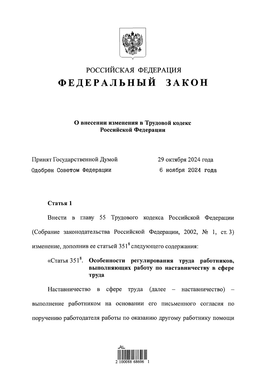 В соответствии с новым законом «наставничество в сфере труда» - это помощь другому работнику в овладении новыми навыками. Наставничество поручается сотруднику на основании его письменного согласия.