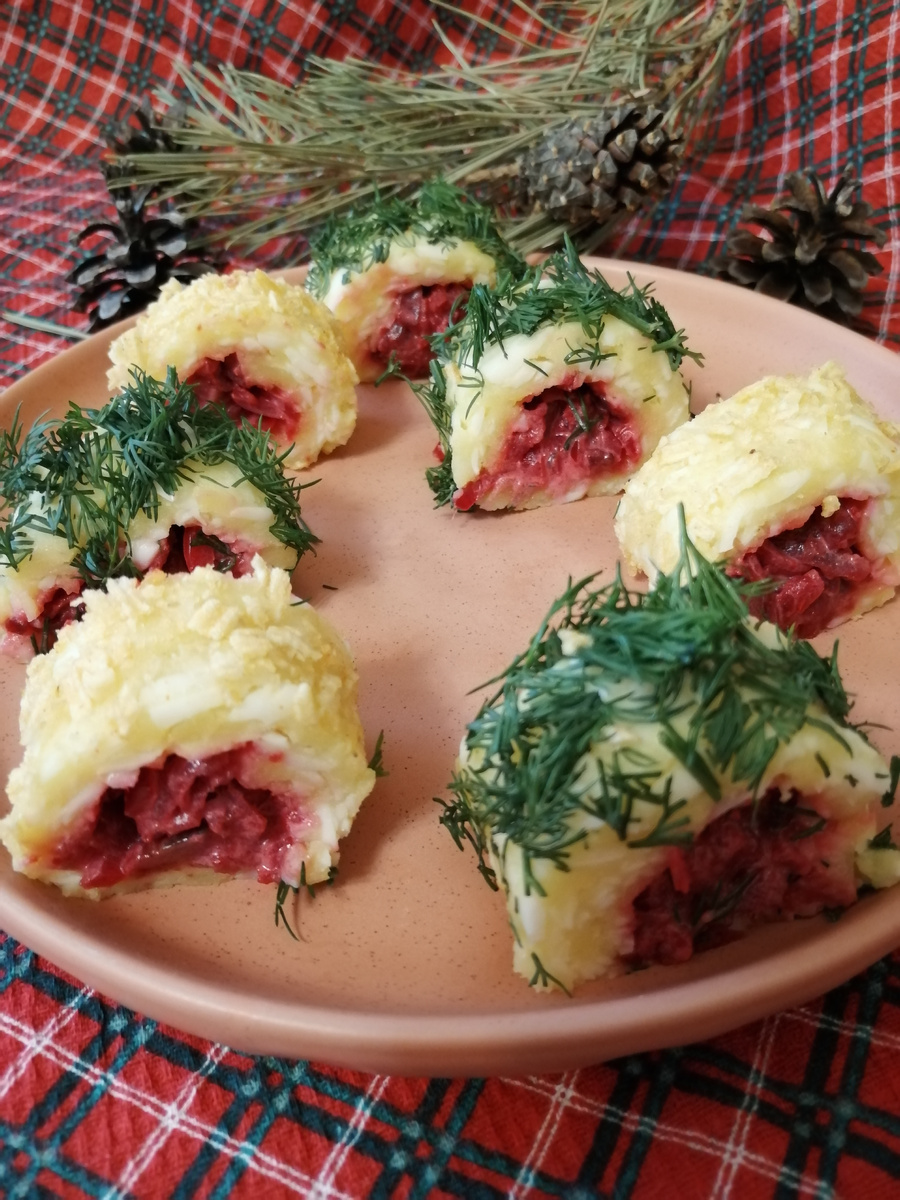 А я к вам с рецептом для новогоднего стола 😉 Да не с простым, а с необычным и очень интересным. Своего рода этот рецепт является конструктором - моделировать можно под свои желания и вкусы. Основа одна, а вот вариаций начинок может быть множество. Итак, ингредиенты: Отварной картофель - 200гр. Плавленый сырок - 70гр. Соль - щепотка Натираем картофель и сырок на крупной терке, немного подсаливаем и вымешиваем эластичное тесто. Теперь берём пищевую плёнку и на ней раскатываем наше сырно-картофельное тесто. Получается вот так красивый пласт, желательно раскатать его максимально равномерно. Вот этот пласт и является основой для вашей фантазии. Сюда вы можете выложить любую начинку: 🔸Селёдка и зелёный лук 🔸Морковь, свекла и кусочки сельди 🔸Отварное яйцо, морковь и горбуша консервированная(а-ля салат "Мимоза") И это только мои варианты! Вы можете добавить/придумать свои. Вот вам и конструктор 😉 В свою сырно-картофельную основу я положила ленивую селедку под шубой, рецепт здесь