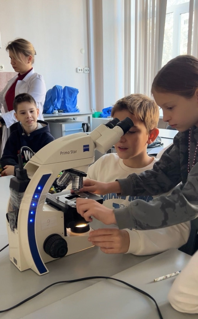 17 ноября под руководством лаборанта НИИ "Биология развития и организации генома" Гоголевой Дарьи Николаевны, а также студенток АБиБ ЮФУ Цыба Ольги Александровны и Федоренко Ирины Сергеевны состоялось практическое занятие для школьников в рамках курса «Биология: от теории к эксперименту». С ребятами рассматривалась тема «Строение растительной клетки». Обучающимся предоставили постоянные препараты клеток для изучения под микроскопами. А также юных биологов научили изготавливать временные препараты растительных клеток на примере томатов, картофеля, лука и груши. Обсудили основные элементы клетки и их функции, строение клеточной стенки, хромопластов, лейкопластов, хлоропластов, структуру плазматической мембраны. Наблюдали склереиды в клетках груши. Углубленно остановились на процессах плазмолиза и деплазмолиза. В конце занятия школьникам подробно рассказами о процессе митоза и его стадиях и предоставили препараты для его наблюдения.
