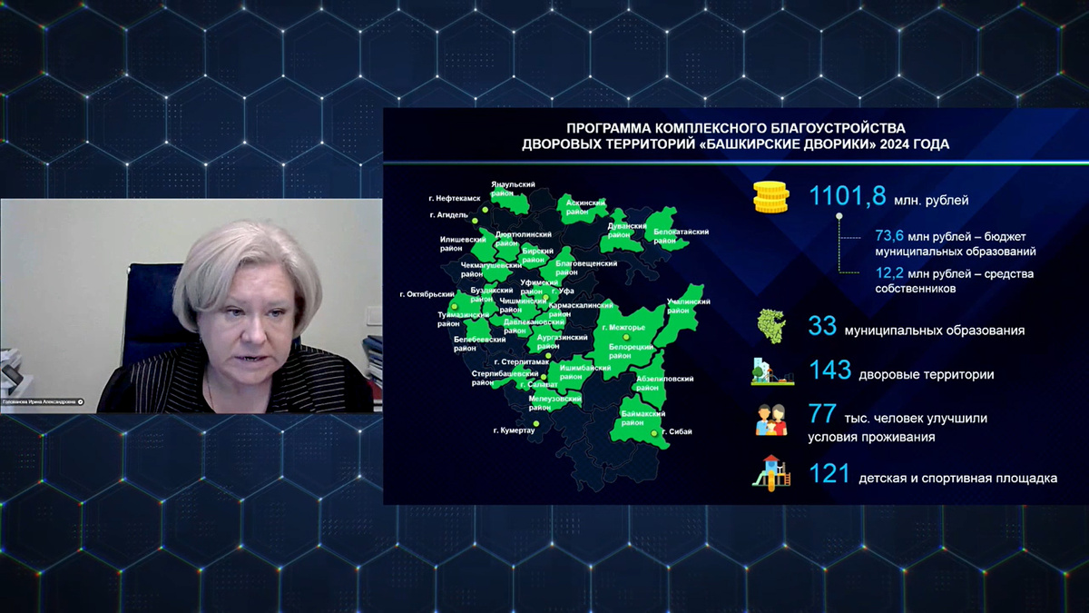 «В текущем году бюджет программы с учетом софинансирования муниципальных образований составил более 1 миллиарда рублей. Это позволило выполнить благоустройство 143 дворовых территорий с охватом 213 многоквартирных домов 33 муниципальных образований. Благополучателями стали 77 тысяч человек», – рассказала Голованова в своем докладе, уточнив, что по своей комплексности программа «Башкирские дворики» – уникальная.