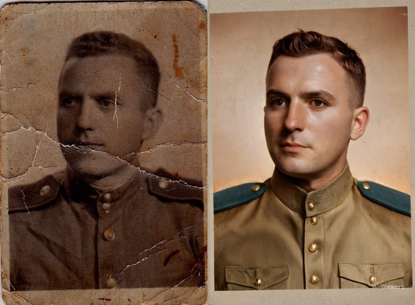 Хочу сразу предупредить, что не стоит ожидать мгновенного идеального результата. Для получения задуманного изображения вам придётся потратить время. Это связано с тем, что нейросети могут добавлять и искажать детали (см. пример выше), и поиск нужной генерации может занять больше времени. Тем не менее, это хороший способ восстановления фотографий. Для примера я взял архивную фотографию солдата РККА с russiainphoto.ru. И сразу извиняюсь за исторические неточности (цвет и форму деталей одежды), этим можно заниматься долго и обычно это ручная работа. Цель статьи — не достичь идеального результата, а показать сам процесс 👇