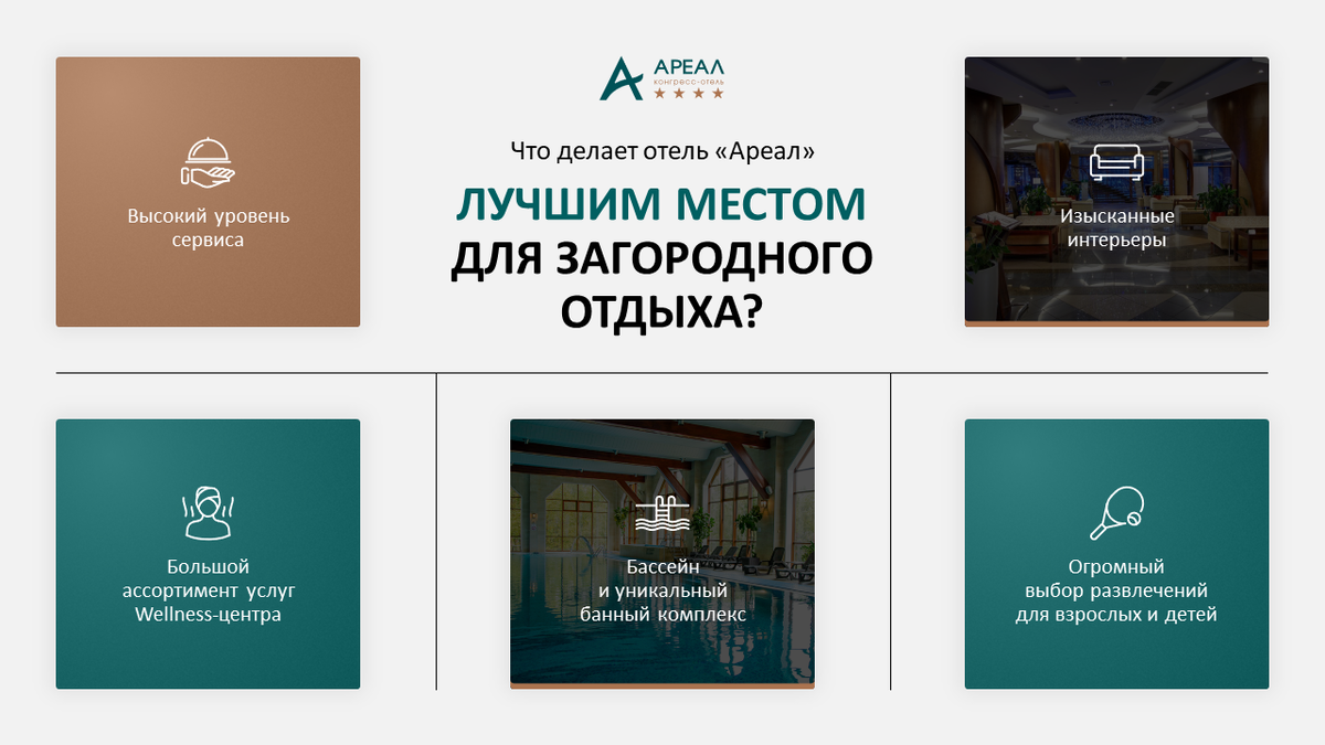 Все мы визуалы, поэтому помимо текста и фотографий в презентации можно использовать еще один доступный нам инструмент – иконки. На примере ниже мы использовали линейные иконки (нестареющая классика). Главное их преимущество – универсальность, так как они идеально вписываются практически в любой проект. Исходный слайд был таким. Мы убрали фотографию с фона (создает лишний "шум", мешает сфокусироваться на тексте). Добавили логотип и заголовок. Сделали композицию из пяти блоков под ключевые преимущества отеля. Добавили тонкие декоративные линии. Чтобы слайд выглядел интереснее, перекрасили один блок в золотой цвет (с логотипа) и для глубины добавили поверх текстуру + в двух блоках разместили фоново фотографии с затемнением (чтобы текст легко читался). Выбрали на сайте flaticon.com набор линейных иконок по забросу «Hotel». Разместили иконки с текстом на слайде. Готово :) Подробную статью "Иконки в презентациях: как использовать из эффективно" вы можете почитать тут. В этой статье на пример