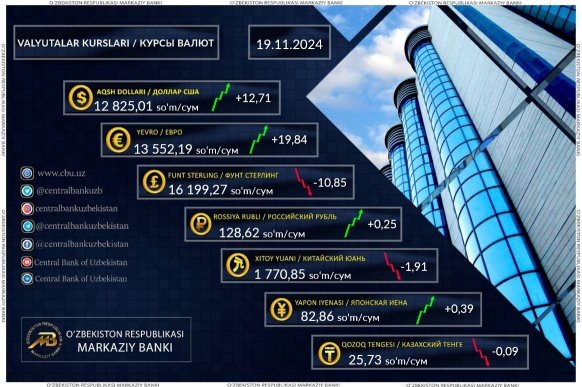 Согласно данным регулятора, на сей раз курс доллара США вырос на 12,71 сум и составил 12 825,01 сумов. Курс евро также вырос на 19,84 сум и составил 13 552,19 сумов. Фунт стерлинг подешевел на 10,85 сум и теперь стоит 16 199,27 сумов.