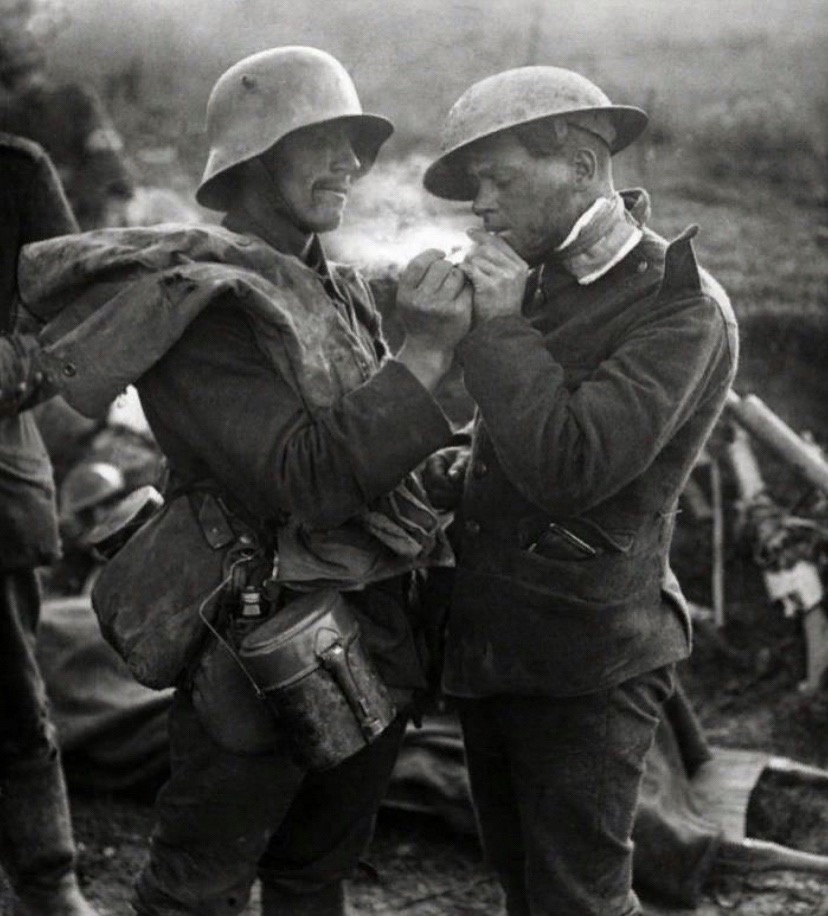 Ретро фотографии всегда привлекают своей исторической самобытностью. Только так мы можем посмотреть на события прошлого через призму настоящего. Что происходило на полях сражений в Первую мировую войну, как жили и гуляли советские женщины в 80-е годы прошлого века? Все это и не только вы сможете узнать прямо сейчас. Усаживайтесь по удобнее, подписывайтесь на канал и начинаем наше путешествие в прошлое! Можно ли представить, чтобы ярые противники столкнулись лицом к лицу не штыками, а переговорами? На этой фотографии запечатлели уникальный момент рождественского перемирия 1914 года. Британский солдат подкуривает папиросу немецкому бойцу. Вероятно, они даже мирно о чем-то беседовали. Правда, эта война продлится еще очень долго, о чем они даже не подозревают. Жизнь не предсказуемая штука, вчера вы рвали друг другу глотки по приказу чужих дядек, а сегодня курите и беседуете вместе, а завтра продолжите рвать глотки. Эта фотография не просто красивая, но и уникальная. Почему-то многие люди