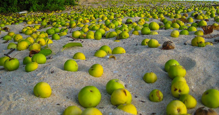 Испанцы прозвали это растение "яблоком смерти". В плодах этого дерева содержится опасный токсин - форбол. Опасность этого вещества заключается в том, что он хорошо растворяется в воде. Поэтому если вы решите спрятаться от дождя под манцинелловом деревом, то его сок будет незаметно стекать с листьев прямо на ваше тело, постепенно разъедая кожу словно кислота и оставляя сильные ожоги.