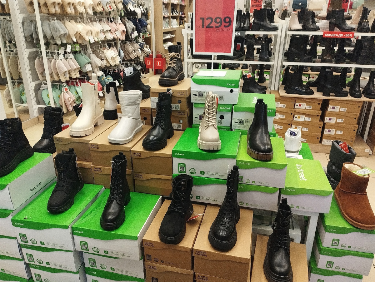 Баннер говорит нам о том, что цена от 1299 рублей. И почти половина показанных ботинок подходит под это описание, особенно из тех, что в черном цвете. Были и более высокие цены, правда ни одна из просмотренных мною пар обуви не дошла даже до трех тысяч, представляете? Забавно что в "Зенден" мы пришли с рынка, где искали низкие цены, а по итогу там оказалось дороже, чем в масс-маркете.