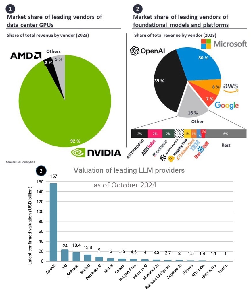 · Рынок базовых моделей и платформ генеративного ИИ более фрагментирован. Но и здесь Open AI является лидером рынка с долей рынка 39%, а его близкий союзник и инвестор Microsoft следует за ним с 30% (что суммарно дает 69% рынка).