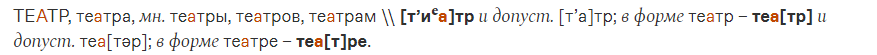 2) теа[тəр], где, наоборот, появляется еще один гласный - краткий (редуцированный) [ə], он еще изображается в транскрипции часто как [ъ]. Тогда в слове будет 3 слога. Именно эта особенность произношения заставляет детей иногда писать театор. Алексей Сидоренко