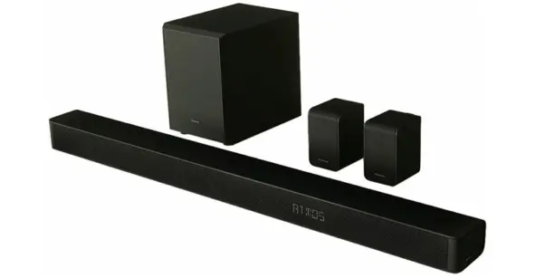 На следующей позиции находится саундбар HISENSE U5120G. Эта модель предлагает объемный звук, усиливающий впечатления от просмотра телевизора Hisense, и создает домашнюю кинотеатральную атмосферу. Оснащенный 11 динамиками и сабвуфером мощностью 180 Вт, общий звук достигает выдающихся 510 Вт. Одной из особенностей является возможность беспроводного подключения тыловых колонок для полноценного объемного звучания.