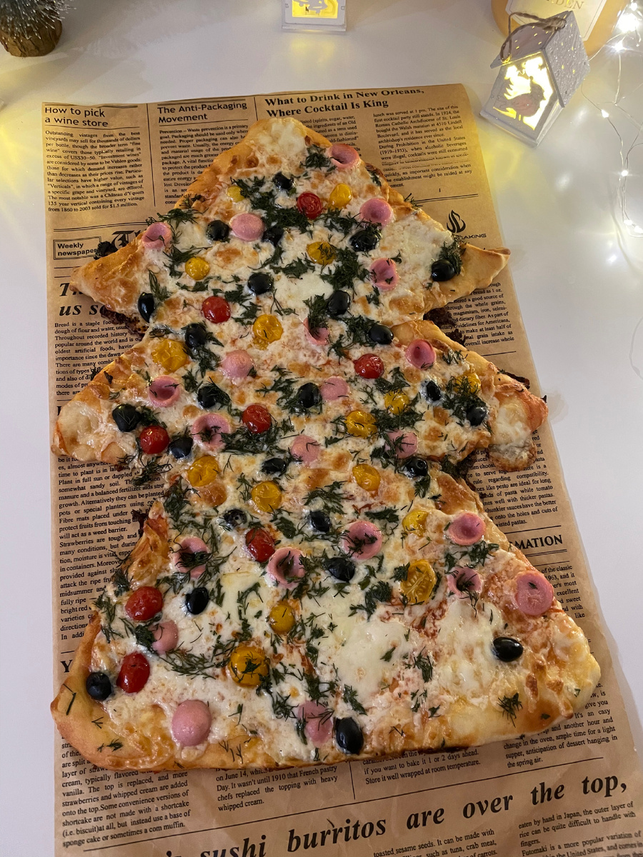 На выходных, вы знаете, у меня традиция печь что-то вкусненькое. В этот раз решила приготовить пиццу по-новогоднему. Это не сложно, но настроение создается уже другое. Мне кажется, пиццу любят все без исключения. По крайней мере мои дети точно и ни один праздничный стол без пиццы у нас не обходится Трафарет я вырезала из бумаги для выпечки. Тесто у меня обычное, дрожжевое. Я его готовлю всегда стандартно: 1,5 стакана тёплого молока, 1 ч.л соли, 1 ст. ложка сахара, 2-3 ст. ложки растит. масла, мука ~1 кг, пакетик дрожжей. Замешиваем тесто и ставим подниматься в тёплое место. Когда будет готово, примерно через 1,5 часа, оно должно подняться и увеличиться в объеме в 2 раза как минимум, тонко раскатываем его с помощью скалки. Вырезаем елочку, смазываем томатным соусом, посыпаем тертым сыром через крупную терку. Начинка у меня: помидоры черри, оливки, нарезанные поперёк сосиски, зелень укропа. Запекаем при температуре 180 г минут 20-25. Вкусная пицца «Ёлочка» готова.