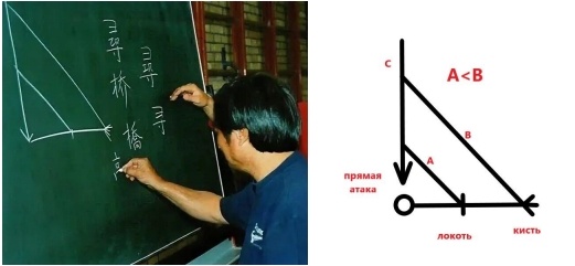Редкое фото 9 (слева) на котором мастер Вонг Шун Леунг объясняет схему маленькой идеи. Справа пояснение схемы. Круг это условная голова человека( для вашего понимания, вид сверху). Который отставил правую руку в сторону, на максимально дальнюю дистанцию от возможной прямой атаки С. Задача человека максимально быстро вернуть руку к линии атаки для защиты. Как мы видим на схеме линия А короче линии B, то есть повторяюсь траектория линии локтя короче чем предплечья и кисти A<B и локоть успеет первым отразить прямую атаку. Так объясняется схема "Маленькой идеи".
