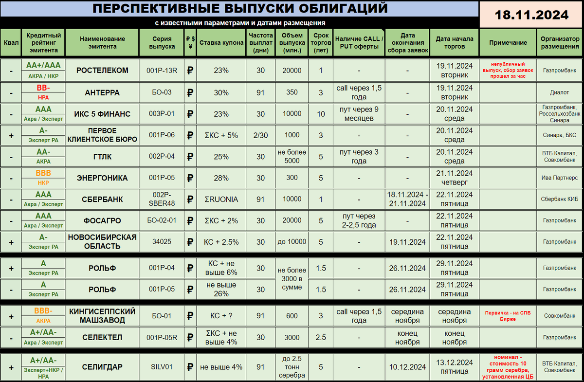 🐯 Здравствуйте, друзья! Начало недели выдается крайне спокойным, долговые новости не заставляют нас метаться в сомнениях :) Но несколько событий заслужили упоминания, не упущу эту возможность :) ---------- 🆕 НОВЫЕ РАЗМЕЩЕНИЯ / АНОНСЫ: 🍁 СБЕР (🅰️🅰️🅰️) продолжает держать марку одного из самых неинтересных любителю облигаций эмитентов. Собственно, до сих пор не понимаю, зачем компания на долговой рынок ходит в принципе - но видимо, чтобы не забыли :) Итак, новый выпуск 002Р-SBER48, встречайте! Объем выпуска - 10 миллиардов рублей, символический для финансовой машины. Срок обращения - 1 год, за это время предусмотрена 4 квартальных купона. Их ставка уже зафиксирована финально - средняя RUONIA за купонный период + 0 (ноль) процентов. Да, без премии, как ОФЗ :) Неужели кассовый разрыв случился? 😀 Сбор заявок проходит до 21 ноября включительно, а свой путь на бирже бумага начнет уже 22 числа, в пятницу. С одной стороны я смеюсь, а с другой - посмотрите на прошлый выпуск с аналогичн