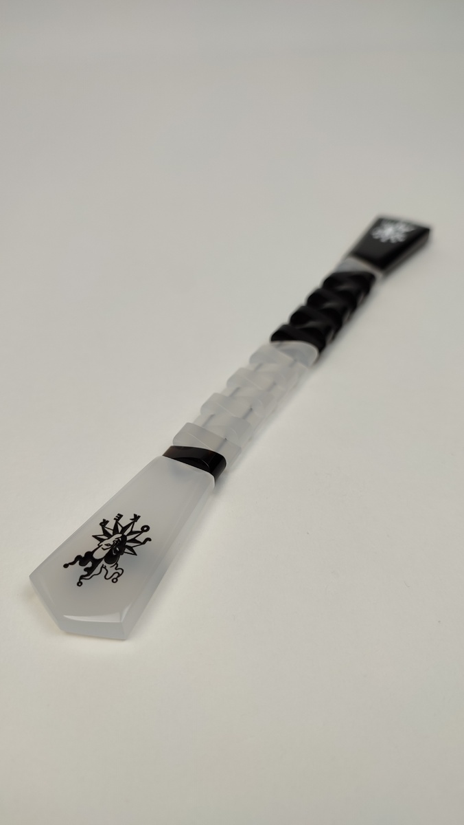 толщина ~ 8−8,5 мм. Гравировка нанесена на четыре поверхности из четырёх, содержит в себе три эскиза. Даная модель словно воплощение контраста и игры. Чёрно-молочная цветовая гамма подчеркивает половинчатый дизайн, создавая эффектную инверсию. Идеальный аксессуар, чтобы добавить стилю нотку харизмы или сделать подарок, который точно запомнится. Кто готов испытать свою удачу?