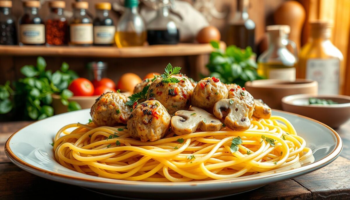 Спагетти с куриными фрикадельками и белыми грибами под трюфельным соусом