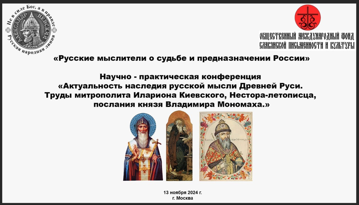 Записи выступлений конференции «Русские мыслители о судьбе и предназначении России» «Актуальность наследия русской мысли Древней Руси. Труды митрополита Илариона Киевского, Нестора-летописца, послания князя Владимира Мономаха» можно посмотреть здесь https://rutube.ru/video/91578841fa68b4b1b3e64324afdbe7e0/?r=plwd